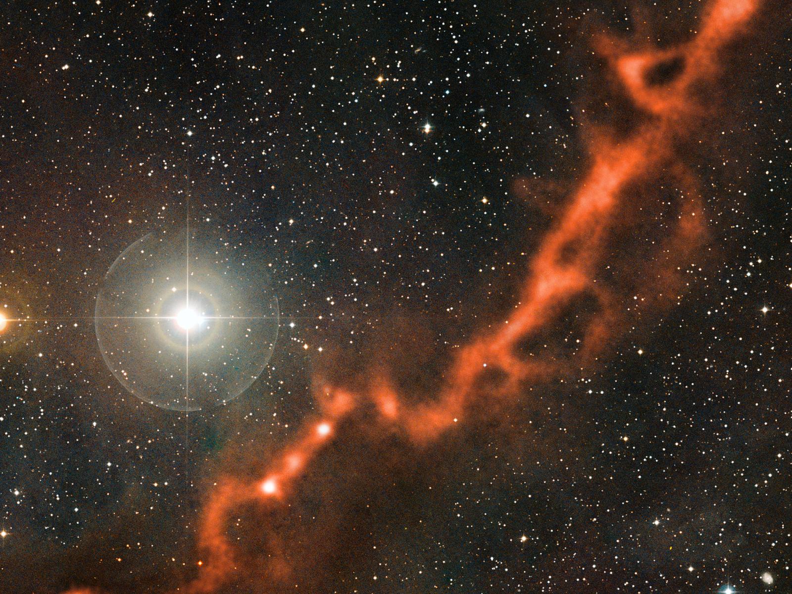 Take this new space photo, for example. It shows a cloud of dust and gas (shown in red) next to a bright star. However, the star is actually much closer to the Earth than the cloud is. Stars like this, which lie between the Earth and the object that an astronomer is trying to observe, are called ‘foreground stars’. They are much brighter than the other stars in photos because they are closer to us.